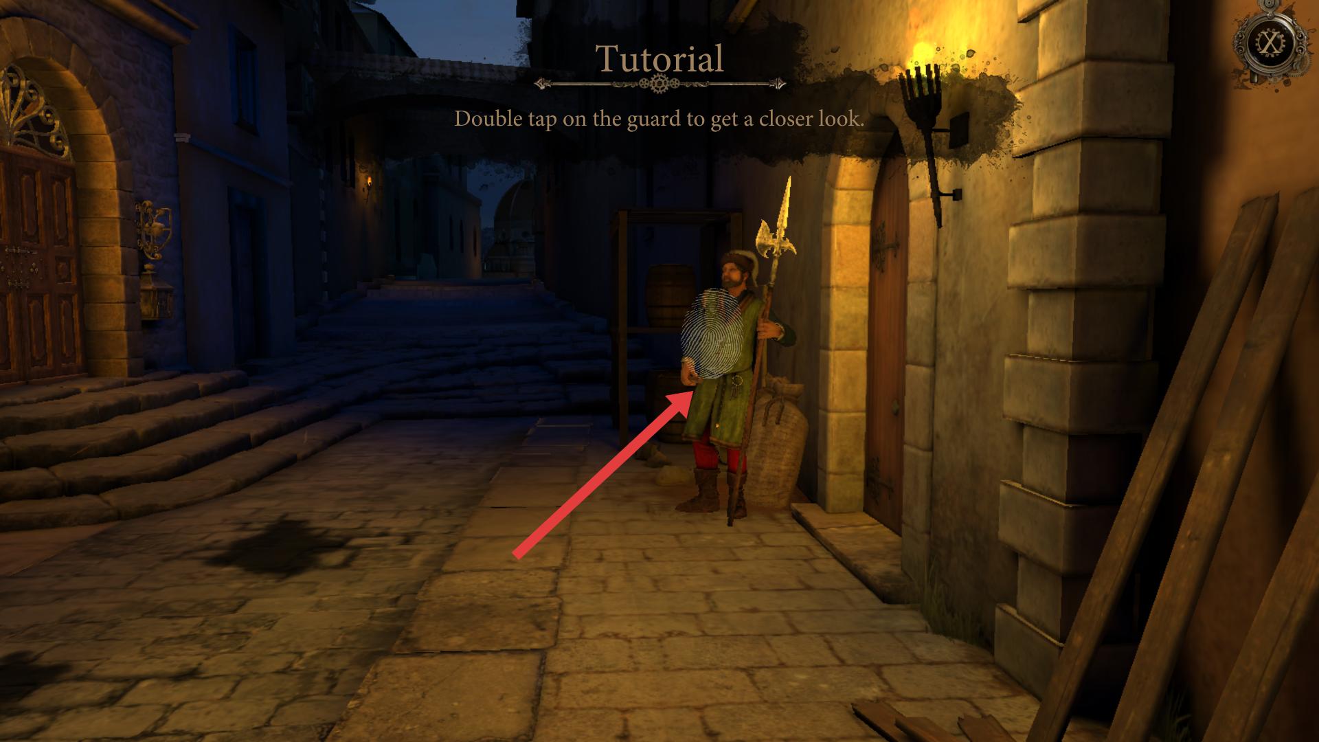 2、進入教程場景后,按照提示,雙擊守衛,能近距離觀察守衛,這是熟悉游戲操作、了解場景元素的重要步驟。