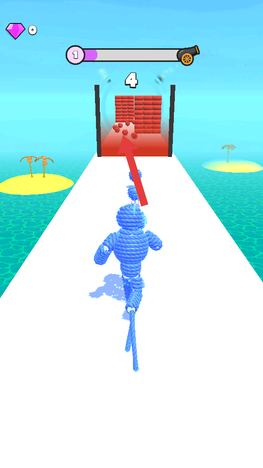 1、在游戲過程,操控藍色繩狀角色在道路上前進,遇到有數字4的紅色磚塊障礙時,要利用自身或道具去突破,繼續向目標邁進。