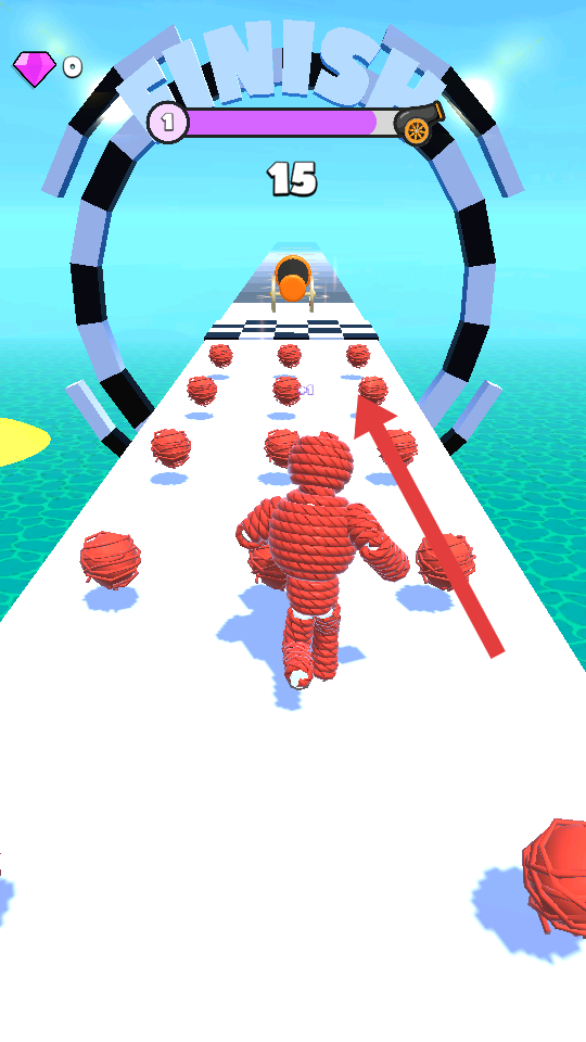 2、紅色繩狀角色行進到有FINISH標識的區域,道路上分布著紅色球體,需靈活躲避或利用這些球體,朝著終點方向推進。