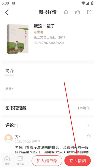 4、在圖書詳情頁面可查看圖書簡介、圖書館館藏等信息,點擊加入借書架或立即借閱,完成圖書借閱。