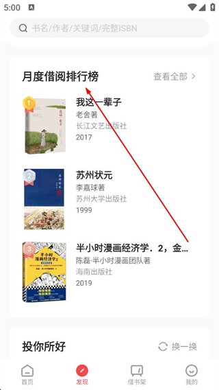 3、進入發現頁面可看到月度借閱排行榜和投你所好區域,點擊月度借閱排行榜的圖書,如我這一輩子,進入圖書詳情頁面。