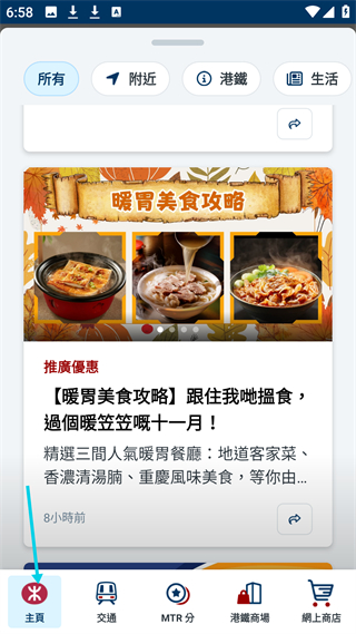 1、主頁,有所有附近、港鐵、生活分類標簽,展示暖胃美食攻略推廣優惠資訊,推薦多家暖心餐廳。