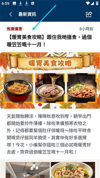 2、最新資訊頁,呈現暖胃美食攻略推廣優惠詳情,介紹多道暖胃美食,為用戶秋冬飲食提供推薦。