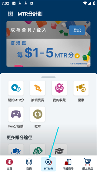 3、MTR分計劃頁,提供成為會員、登入入口,有關MTR分、換領獎賞等功能,還有更多賺分途徑介紹。