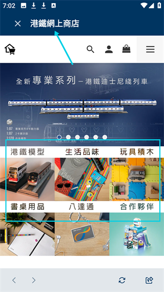 4、港鐵網上商店頁,展示港鐵迪士尼線列車等商品系列,有港鐵模型、生活品味等分類,提供多樣港鐵周邊商品。