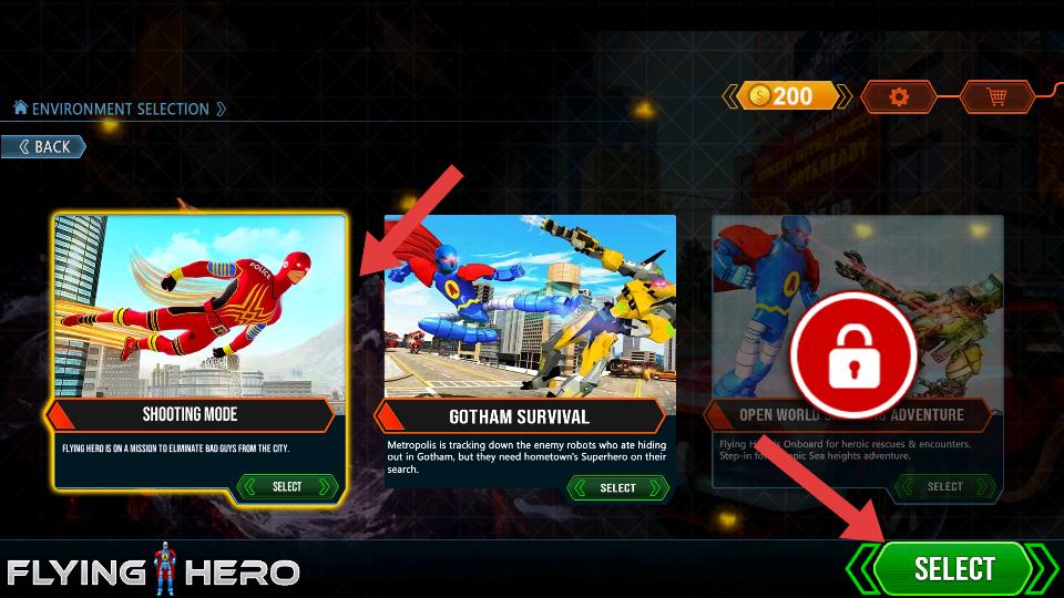 4、接著到環境選擇界面,有SHOOTING MODE,GOTHAM SURVIVAL等模式,選擇其中一個,再點擊SELECT按鈕,就能進入對應游戲場景。