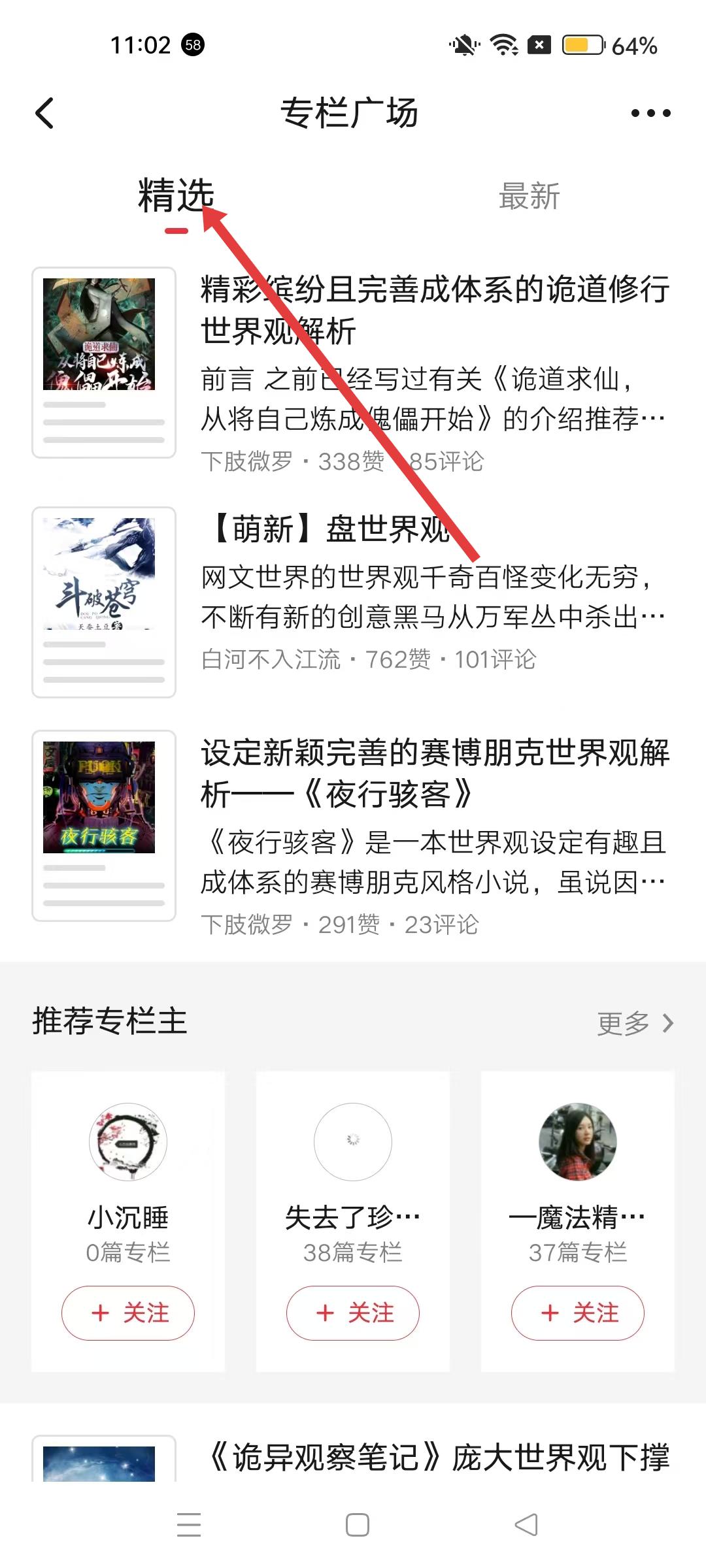 3、專欄廣場,可查看精選專欄,這些專欄包含對小說世界觀、內容的解析等,具有較高的閱讀價值。