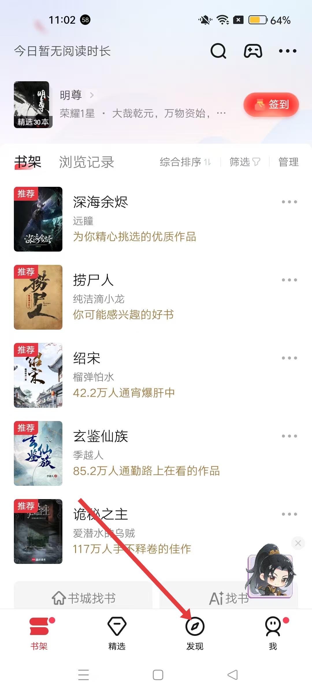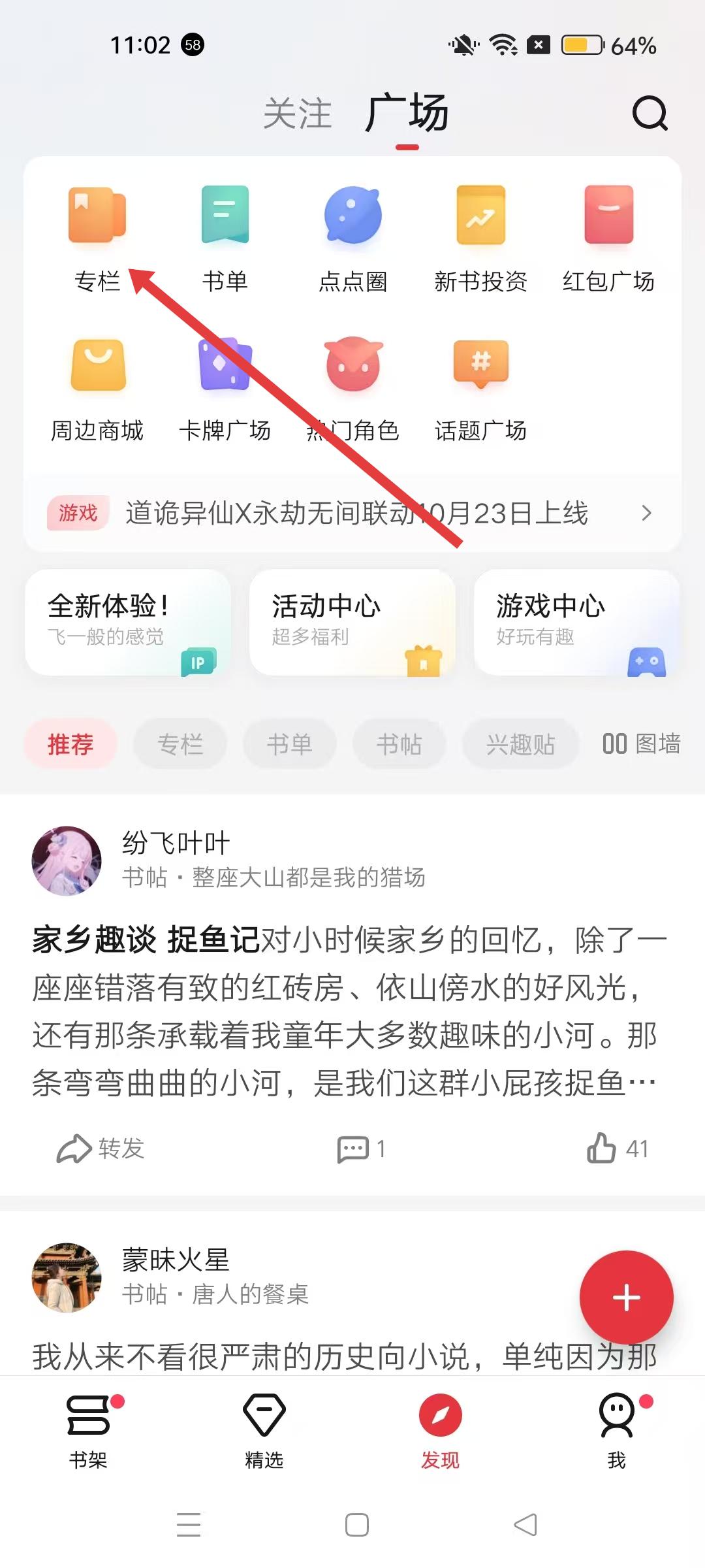 1、起點讀書APP書架界面,點擊發現,可進入發現板塊,該板塊有廣場、專欄等多種功能入口。