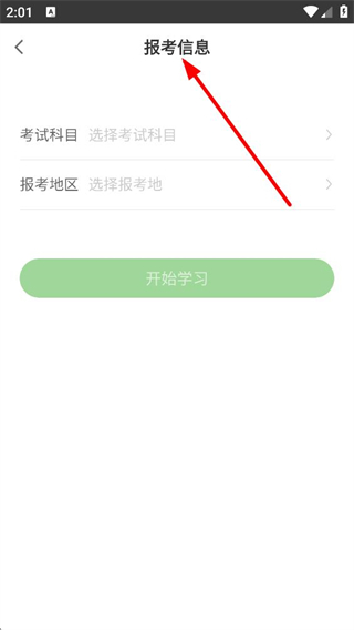 4、進入報考信息界面,需選擇考試科目、報考地區,之后可點擊開始學習,幫助用戶明確考試信息并開啟學習進程。