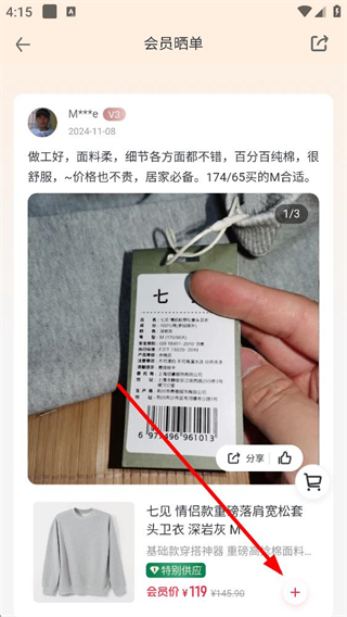 3、曬單詳情頁可看到商品的會員價等信息,點擊頁面中的加號按鈕,可將對應的商品添加到購物車,便于后續購買。
