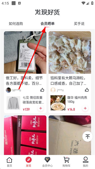1、首頁點擊底部發現按鈕進入發現好貨頁面,可切換至會員曬單板塊,查看其他會員分享的商品使用體驗及評價內容。