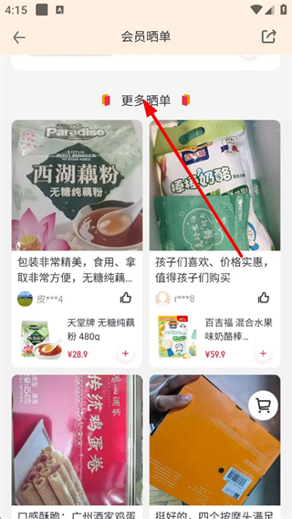 4、會員曬單頁面點擊更多曬單,可瀏覽更多會員分享的內容,獲取更多商品的實際使用反饋,輔助自身的購物決策。