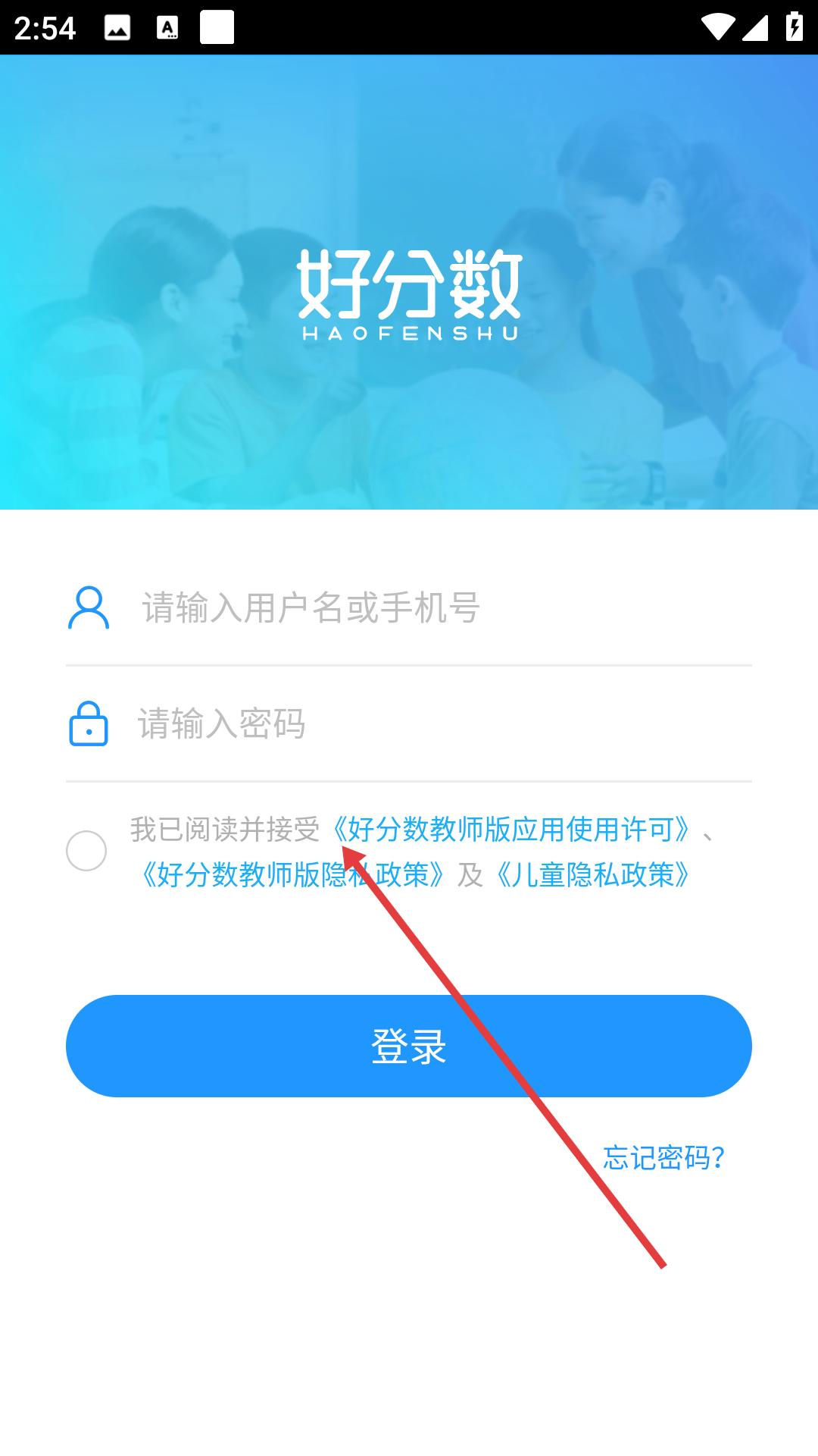 2、好分數教師版登錄頁面需輸入用戶名或手機號及密碼,勾選已閱讀并接受相關協議政策后點擊登錄,若忘記密碼可進行找回操作。