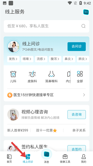 3、線上問診板塊,提供7×24h電話問診服務,有線上問診、視頻心理咨詢、簽約私人醫生等功能,覆蓋多種病癥和科室。