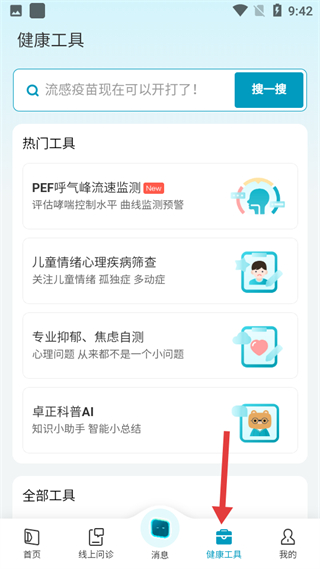 4、健康工具板塊,有PEF呼氣峰流速監測、兒童情緒心理疾病篩查等熱門工具,還有專業抑郁焦慮自測、卓正科普AI等,助力健康監測和知識獲取。
