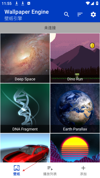 1、點擊壁紙引擎界面,展示多款動態壁紙,像深空、恐龍奔跑等,底部有壁紙、播放列表、添加等功能入口。