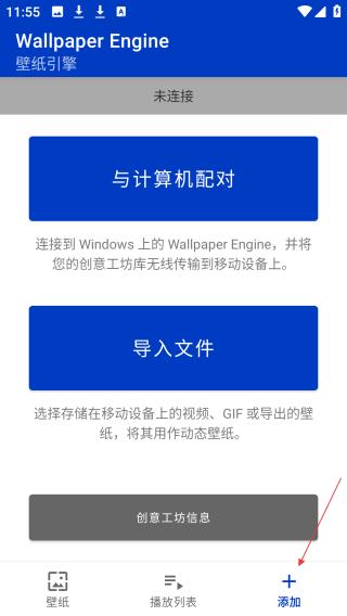 3、點擊添加功能界面,有與計算機配對、導入文件選項,能將創意工坊或本地內容設為動態壁紙。