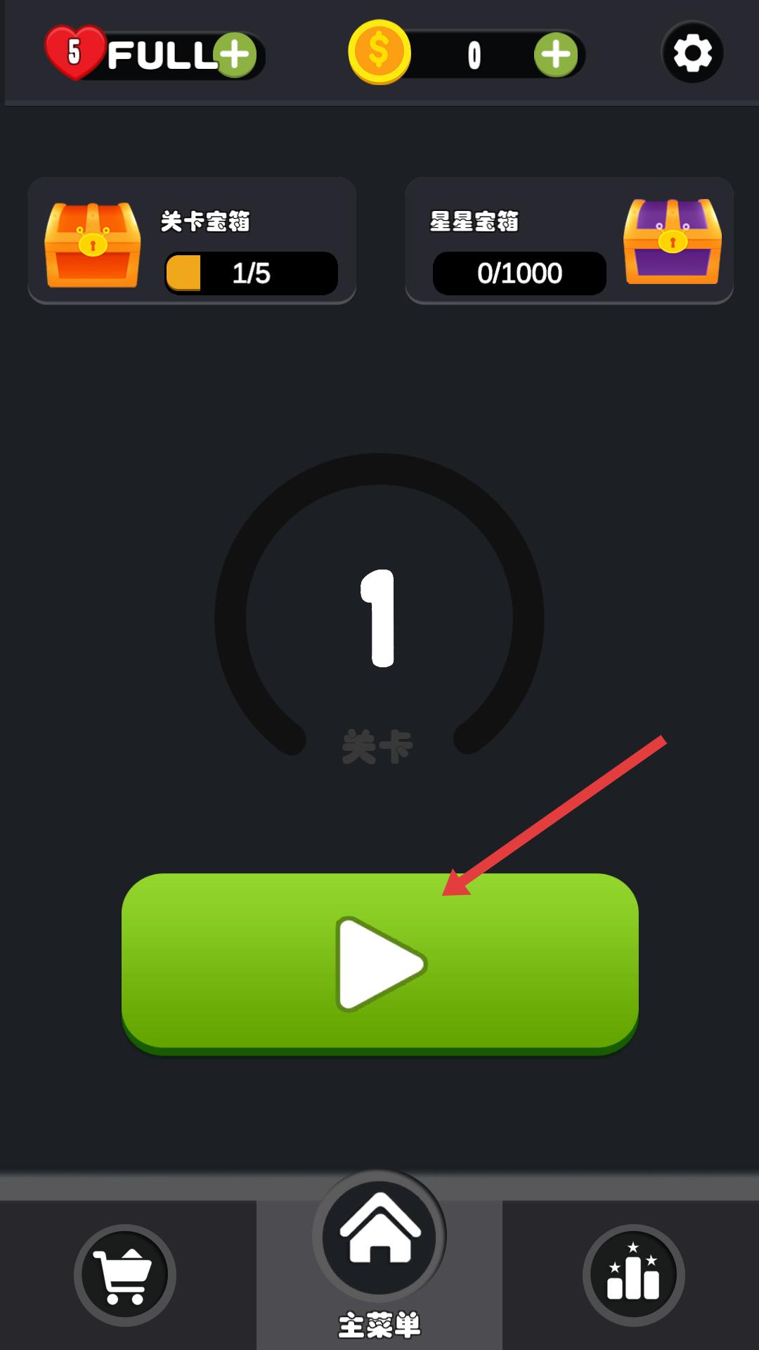 1、玩家下載游戲登入游戲頁面后,點擊綠色帶白色三角形的按鈕,即可進入關卡1開始游戲。