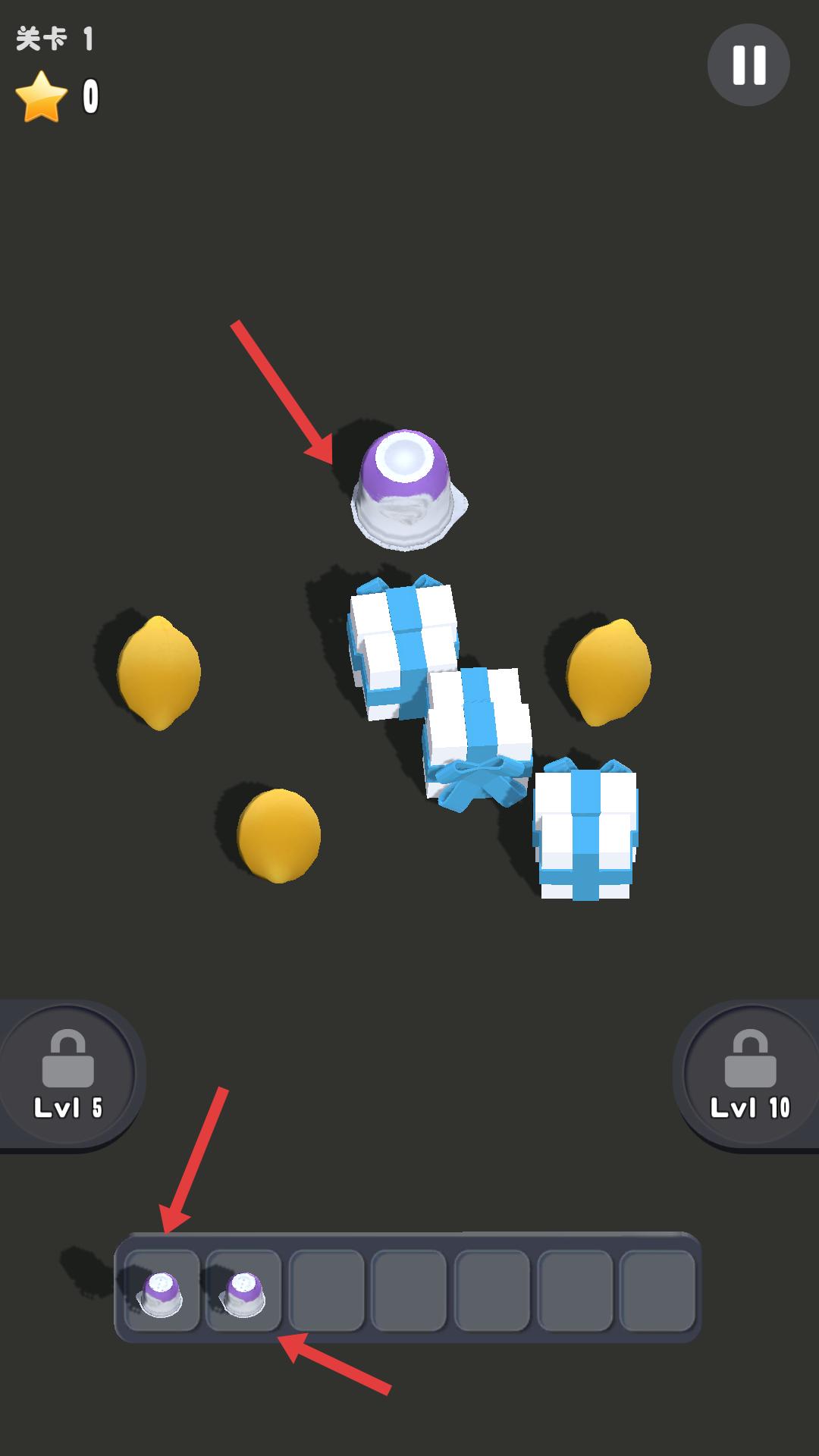 2、游戲中會出現紫色帶白邊的物品,將其收集到下方的格子里,同時還有藍白相間的禮盒和檸檬狀物品。