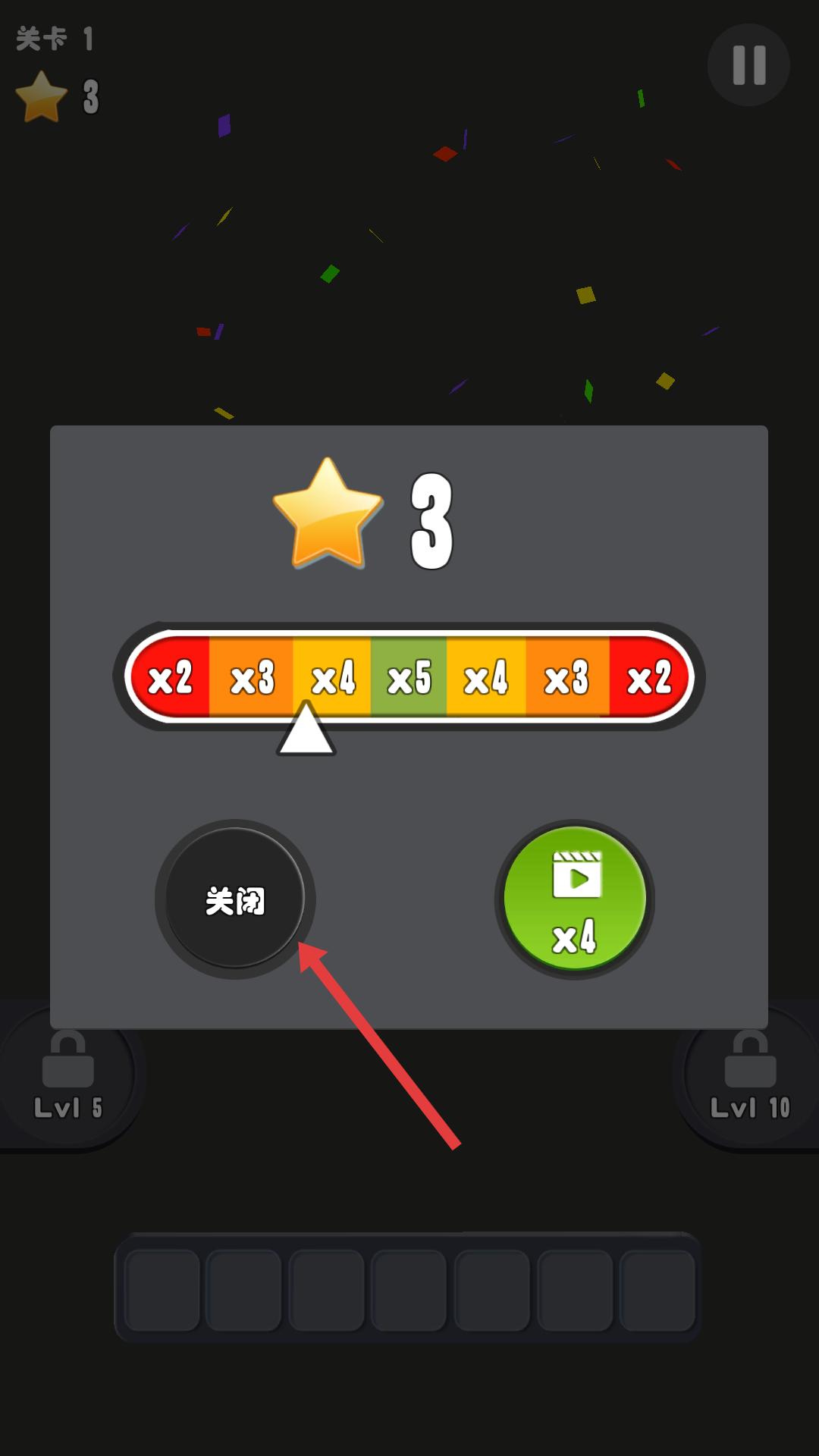 4、關卡結束后會顯示獲得的星星數量,還有倍數條,可選擇關閉彈窗或者觀看視頻來獲得倍數獎勵。