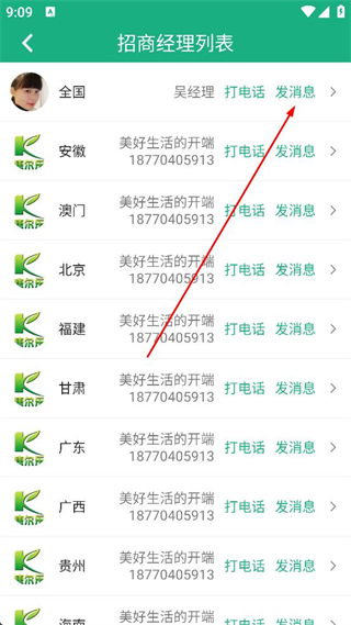 3、在經理列表中選擇對應的經理,點擊發消息,進入與該經理的聊天界面。