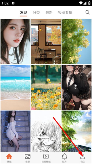 1、進入應用發現頁面,可瀏覽各類壁紙內容,頂部設發現分類等標簽,點擊底部我的按鈕,能進入對應的個人界面。