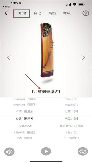 1、聽音界面,展示古箏調音模式,有多種調式可選,每個調式對應不同弦音高,底部有音量、播放等功能按鈕。