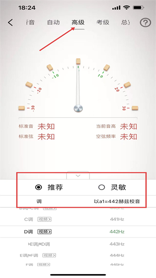 2、調音界面設有指針式音準顯示,還有推薦靈敏入微等模式選項,可按需選擇精準調音。