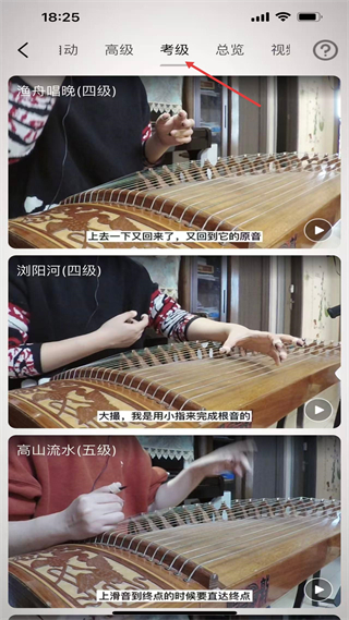 4、考級界面,展示漁舟唱晚、瀏陽河、高山流水等古箏考級曲目視頻,每個視頻配有演奏技巧說明。