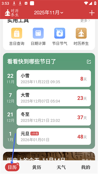1、時歷養生APP日歷頁,顯示2025年11月,有吉日查詢等工具,展示小雪、元旦等節日節氣及倒計時天數。