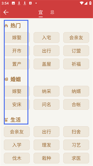 2、黃歷頁,分宜、忌,含熱門、婚姻、生活分類,熱門有嫁娶等,婚姻有安床等,生活有會親友等,提供黃歷宜忌查詢。