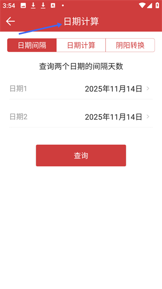 3、日期計算頁,可進行日期間隔等計算,能查兩個日期間隔天數,有日期選擇和查詢按鈕,滿足日期計算需求。