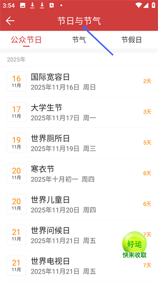 4、節日與節氣頁,分公眾節日等,展示2025年11月國際寬容日等節日及倒計時天數,方便了解節日信息。