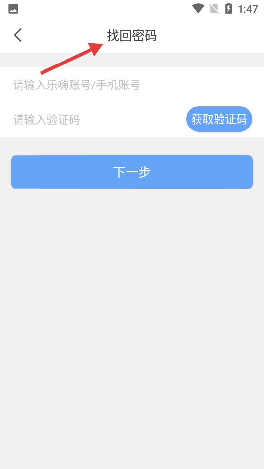 2、找回密碼頁面,在此輸入樂嗨賬號或手機號,獲取驗證碼后按步驟操作,便可找回遺忘的密碼。