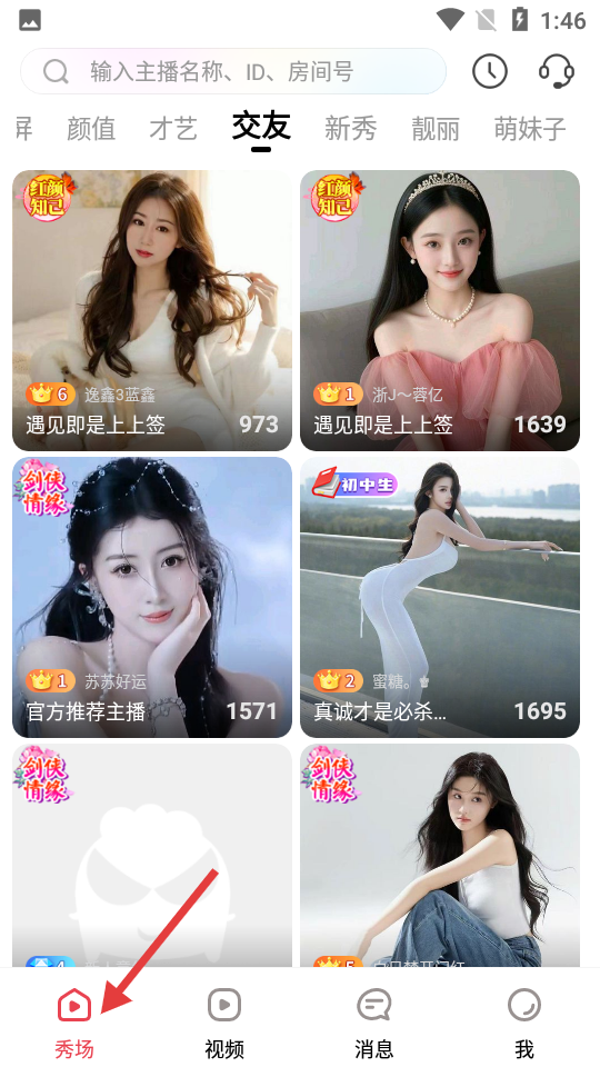 3、末張為秀場界面,交友分類呈現眾多主播,可通過搜索欄查找特定主播,輕松開啟互動娛樂體驗。