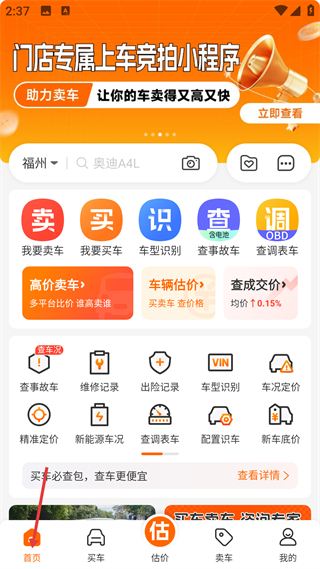 1、首頁,可賣車買車查車況,有高價賣車等服務,聚合核心功能,助力車輛交易更高效。