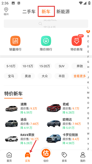 2、買車板塊含新車等分類,可按價格品牌選車,展示特價新車及降價信息,幫用戶快速找合適車源。