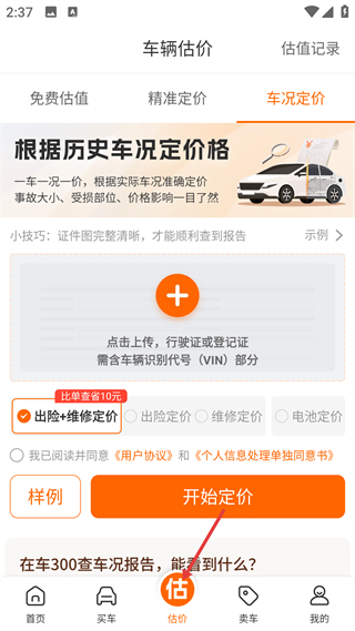 3、估值板塊設三種定價方式,車況定價需上傳含VIN的證件,結合出險維修記錄,精準核定車輛實際價值,助力合理評估。