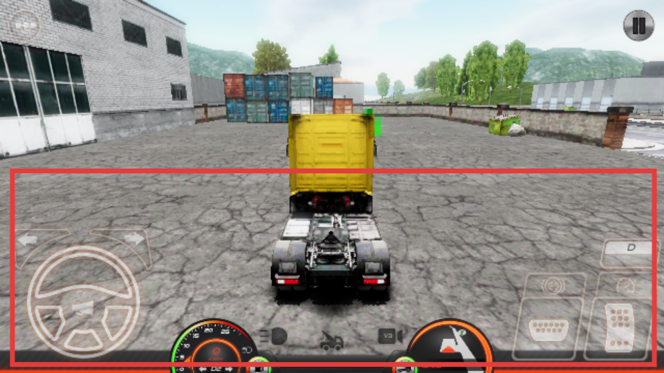 4、卡車引擎啟動后,利用屏幕左側的方向盤控制方向,右側的相關按鈕進行擋位等操作,駕駛卡車在場地中行駛,熟悉操作完成運輸等任務。
