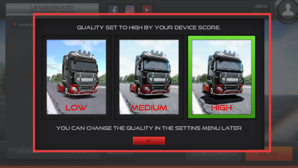 1、游戲開局會彈出畫質設置窗口,有低、中、高三種畫質可選,若設備性能較好可選擇高畫質,獲得更優質的畫面體驗,之后點擊OK確認設置。