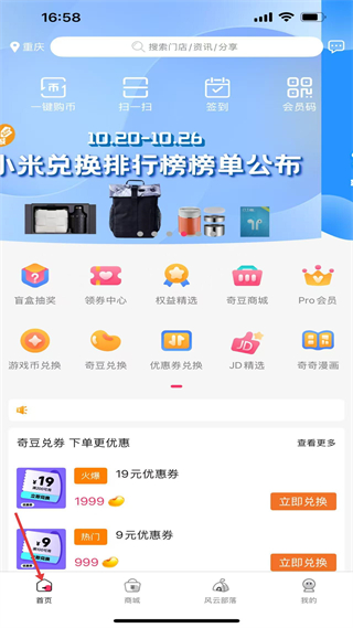 1、首頁,定位重慶,有一鍵購幣等功能入口,還有盲盒抽獎等板塊及奇豆兌券優惠活動,方便用戶參與互動與優惠兌換。