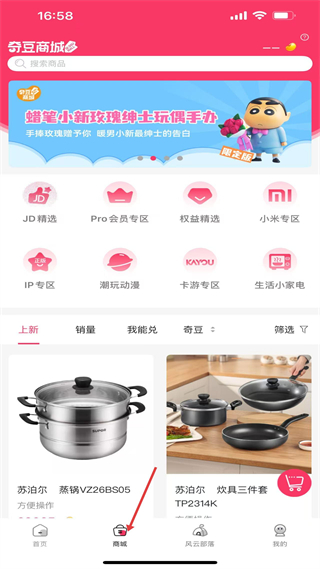 2、奇豆商城,有JD精選等分類,展示蠟筆小新限定手辦banner,還有蘇泊爾蒸鍋等商品,提供商品選購與會員專屬權益。