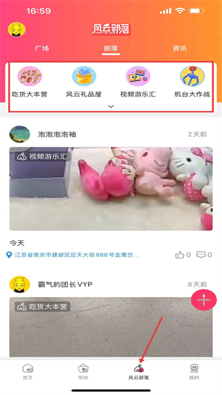 3、風云部落,分廣場、部落、資訊板塊,部落下有吃貨大本營等分類,還有用戶分享內容,是用戶交流互動的社區板塊。