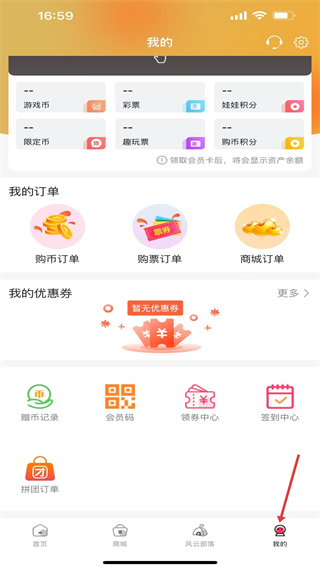 4、我的個人中心,有游戲幣等資產板塊需領會員卡顯余額,還有訂單、優惠券等功能,可管理訂單與資產。