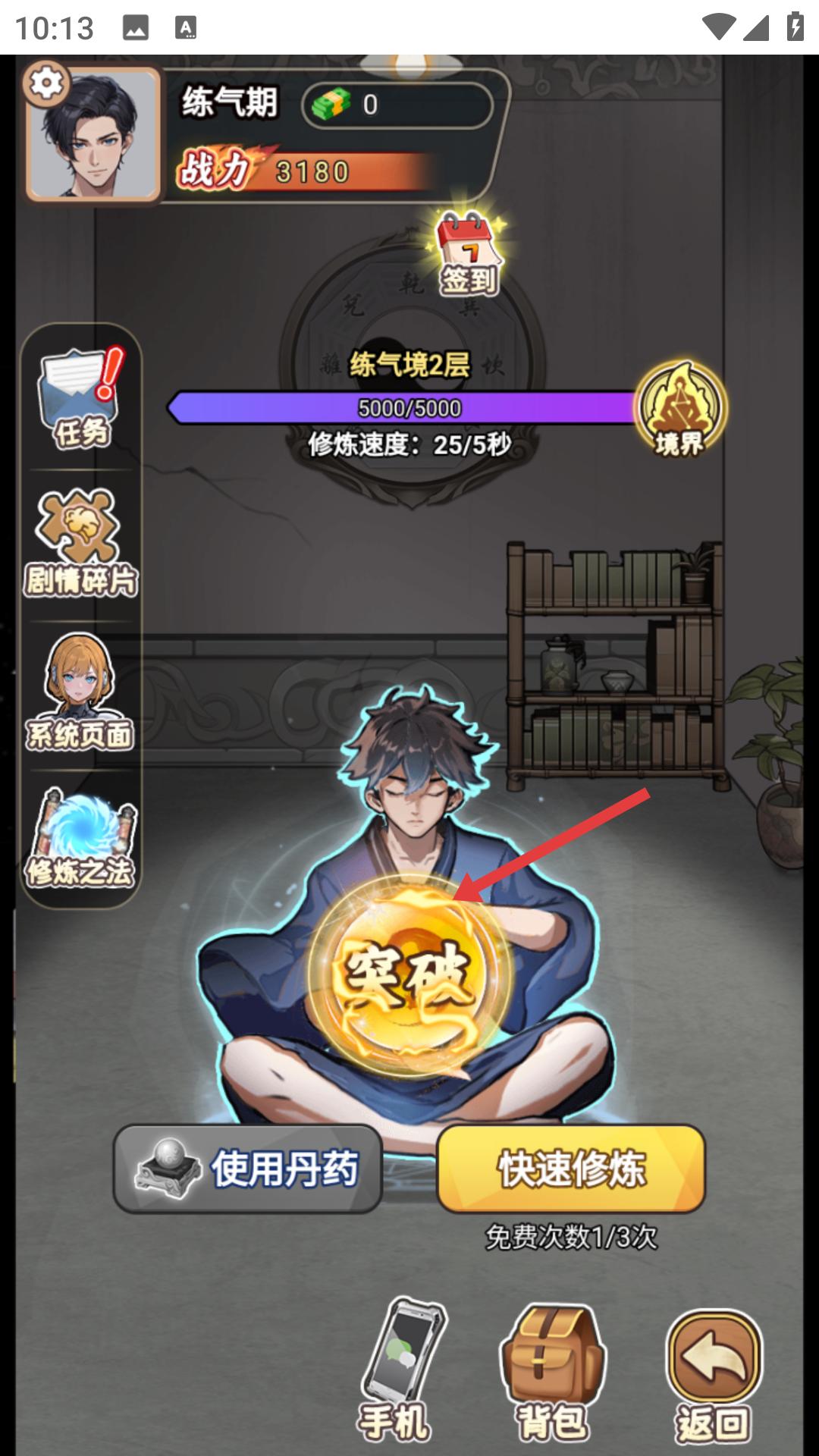 3、進入修煉界面后,當修煉進度達到當前境界上限,點擊【突破】按鈕,嘗試突破到更高的練氣境界,增強戰力。