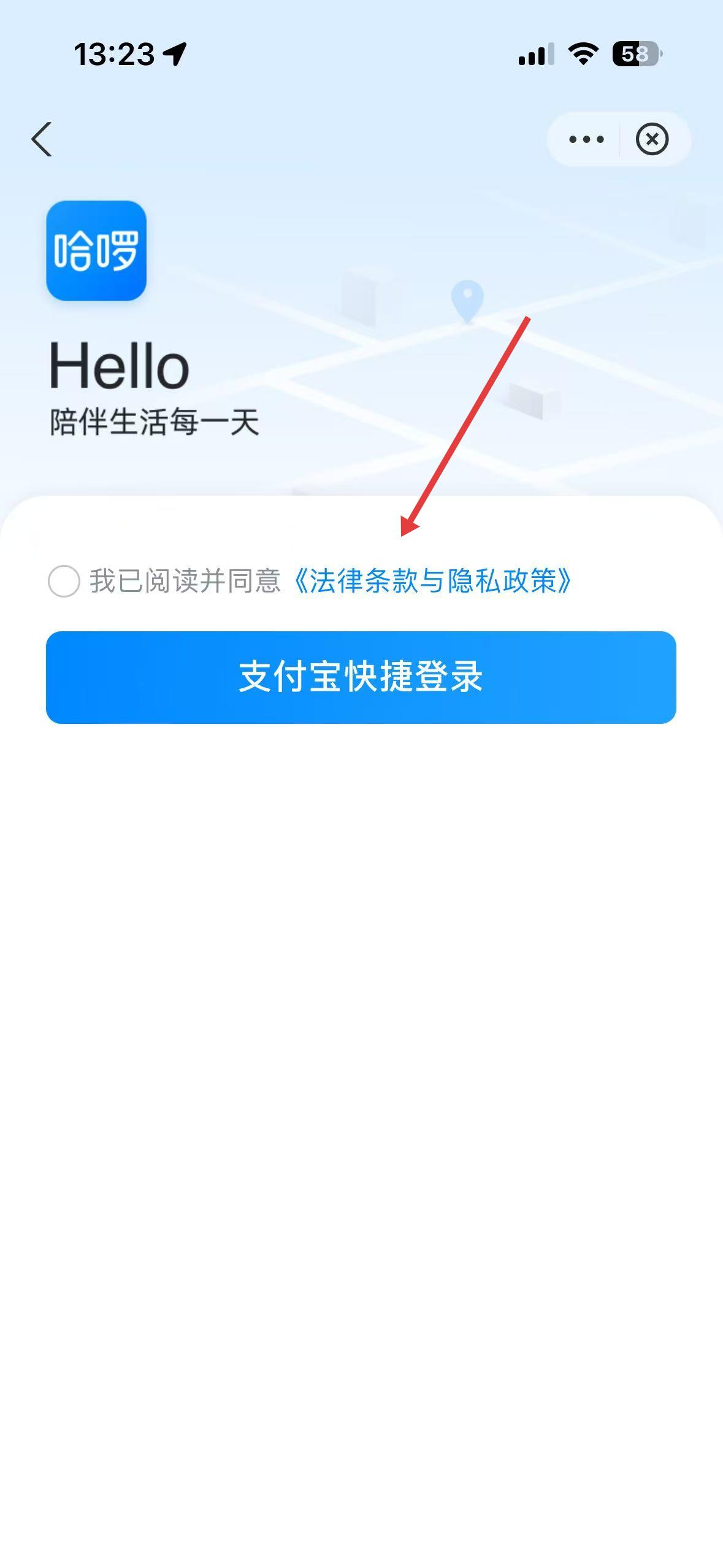 3、登錄界面,勾選我已閱讀并同意法律條款與隱私政策后,可點支付寶快捷登錄,完成賬號登錄。