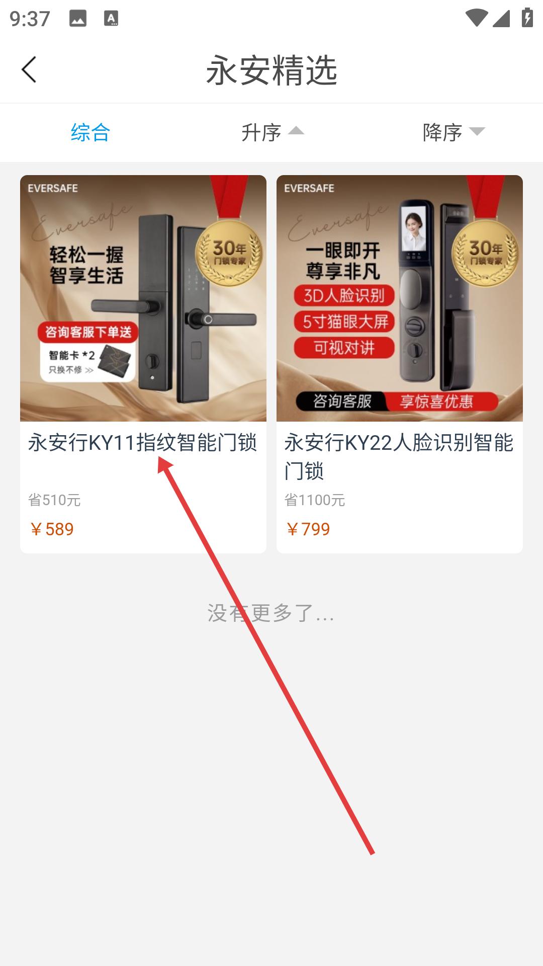 2、在永安精選頁面,點擊永安行KY11指紋智能門鎖,進入商品詳情頁面。