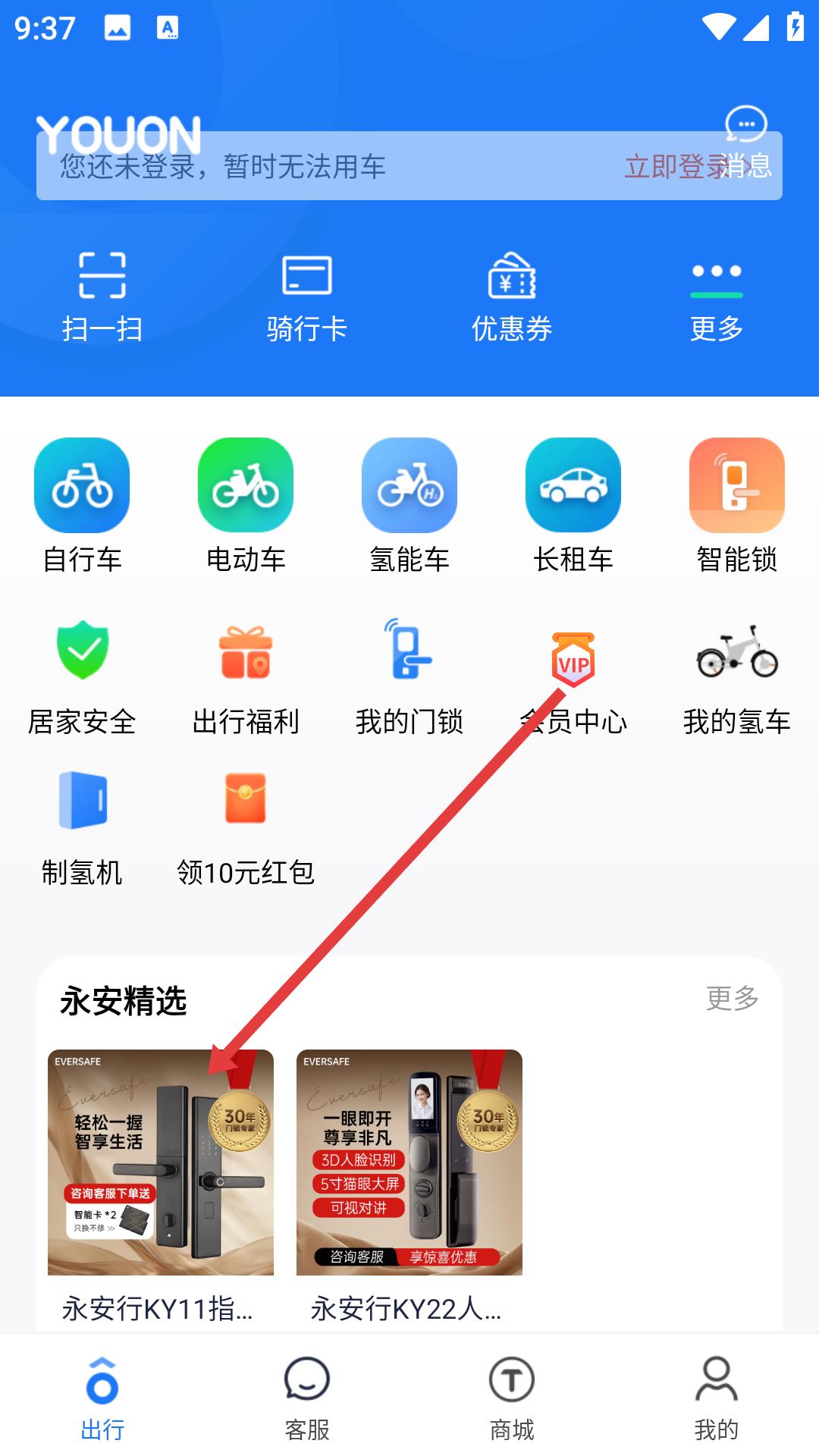1、進入永安行APP首頁,在永安精選板塊找到永安行KY11指紋智能門鎖推薦,點擊進入永安精選頁面。