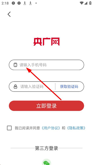 3、登錄界面,輸入手機號碼獲取驗證碼,點擊立即登錄,登錄前需勾選同意用戶協議和隱私政策,也可選擇第三方登錄方式。