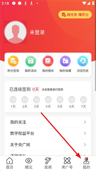 2、點擊底部我的按鈕,進入個人界面,可看到未登錄提示,還有積分簽到、我的活動等功能入口,未登錄時可進行登錄操作。